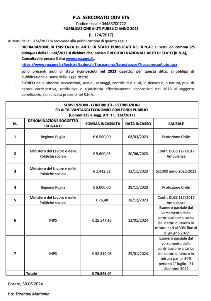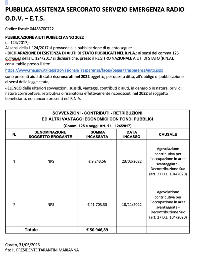 • MINISTERO DEL LAVORO – POLITICHE SOCIALI £ 51,78 24/12/2020 CONTRIBUTO AMBULANZE E BENI STRUMENTALI ART. 76 D.LGS 117/2017